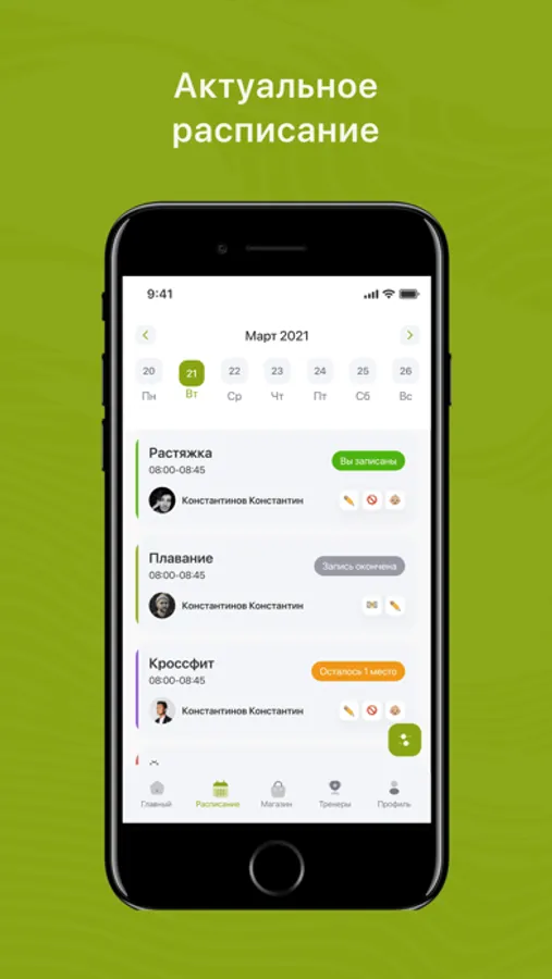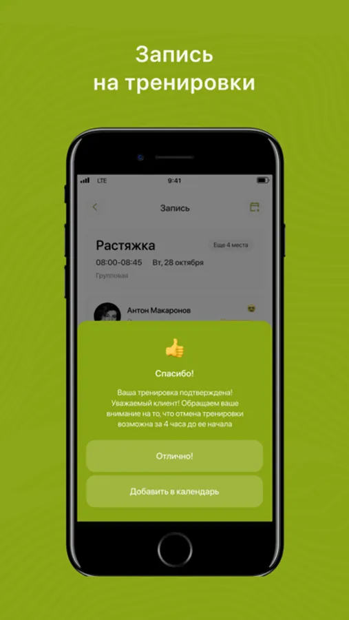 - Получать PUSH-уведомления о предстоящей тренировке за 3 часа;
