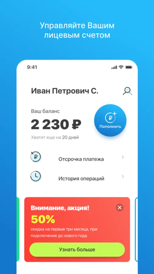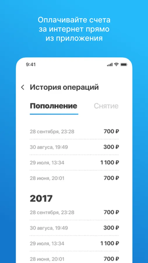 Просматривайте баланс, историю платежей, историю списаний за услуги по вашему договору.