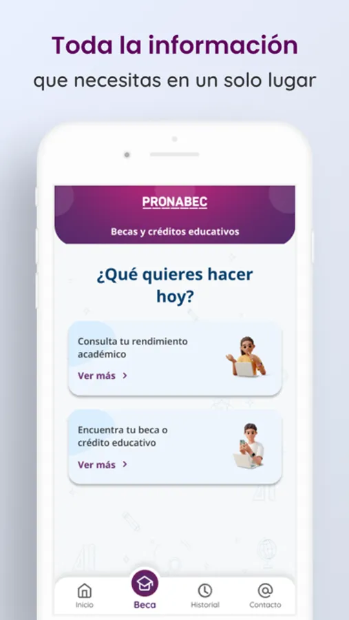 Esta nueva versión de la app, te brindará el acceso de una manera rápida y eficaz a la información de las becas que se ajustan de acuerdo a tu perfil, consultar tu rendimiento académico, visualizar los principales de canales de atención y las redes oficiales del Pronabec.