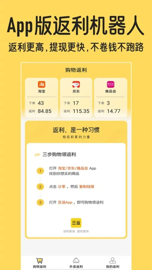 因为微信返利机器人很容易被微信官方封禁,经常用着用着就跑路了,不光还未到账的返利金额无法提现,还需要不嫌麻烦地寻找它的替代品。豆返App是一款App版的返利机器人,完美解决了容易被微信官方封禁导致跑路的问题。