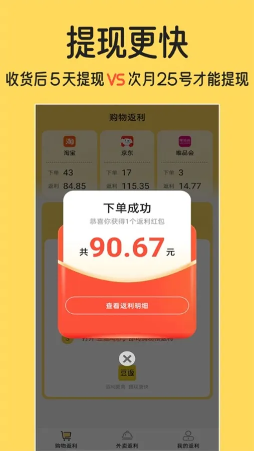 很多返利软件提现慢的根本原因是,整个系统是按照上下级抽成机制设计的,即使你没有下级,也会受整个上下级结算机制的拖累导致提现很慢。豆返App定位于纯自用的返利App,没有上下级也不会牵涉上下级结算,所以提现就会快很多。