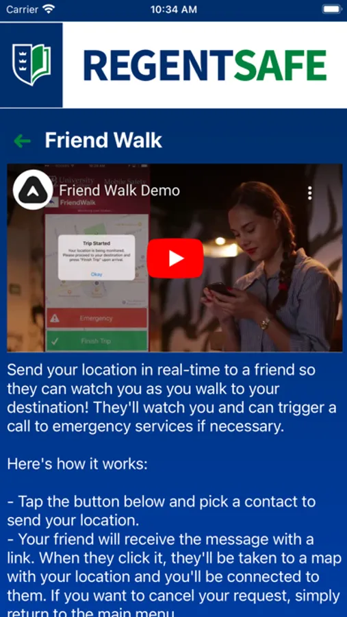 - Virtual WalkHome: Allow Campus Security to monitor a user’s walk. If a user feels unsafe when walking on campus, they can request a Virtual WalkHome and a dispatcher on the other end will monitor their journey until they reach their destination.