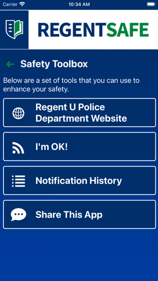 Regent Safe is the official safety app of Regent University. It is the only app that integrates with Regent University's safety and security systems. University Police have worked to develop a unique app that provides students, faculty and staff with added safety on the Regent University campus. The app will send you important safety alerts and provide instant access to campus safety resources.