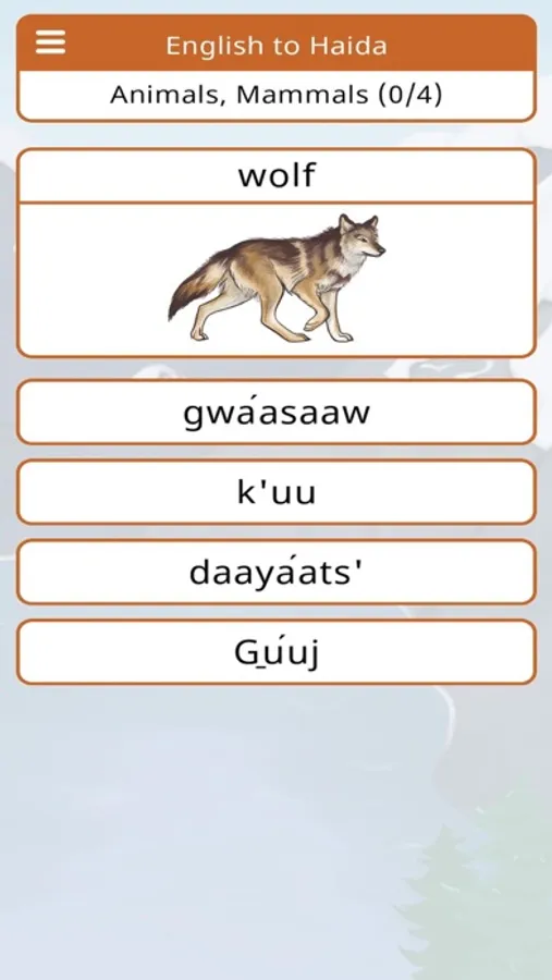 Build your Haida vocabulary with the Haida Vocab Builder game for your iOS phone or tablet. Quiz yourself every day to learn different categories – animals, food, drinks, and more! The app includes: