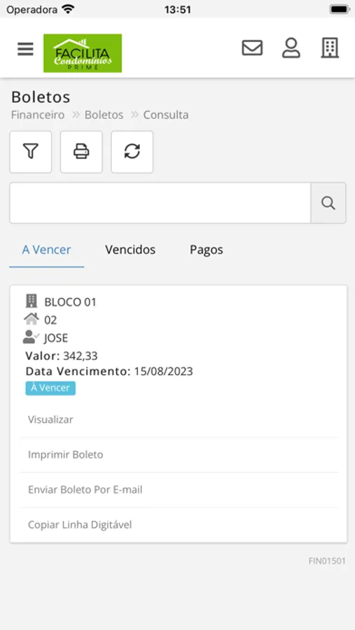 - Visualização de boletos em aberto para sua unidade;