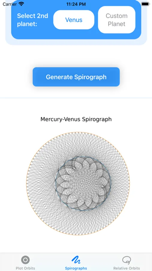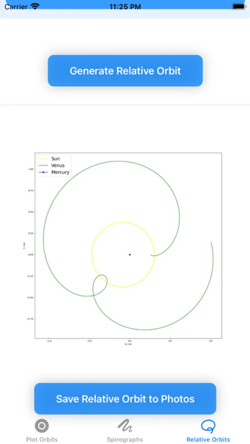 - Save interesting spirographs and relative orbits to your Photos to create your unique collection