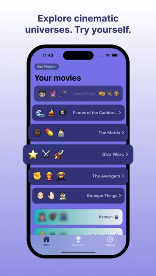 Flicker is not just a quiz, it's a journey through the world of cinema that will allow you to remember the highlights and symbols of your favorite films or series. Join and prove that you are a real movie expert!