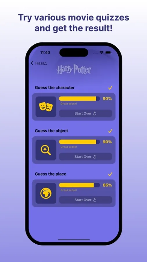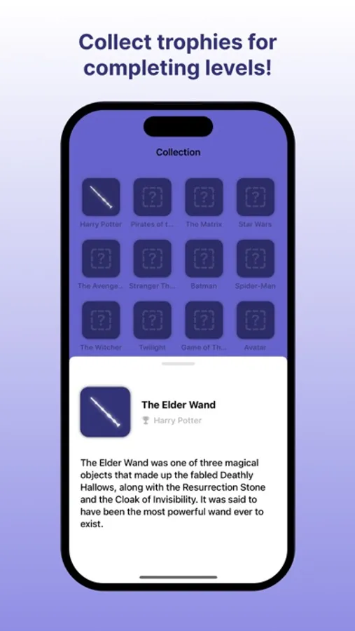 Delve into the fascinating world of cinema through levels full of exciting and interesting questions. Each level is a real journey into the universe of a particular movie or series.