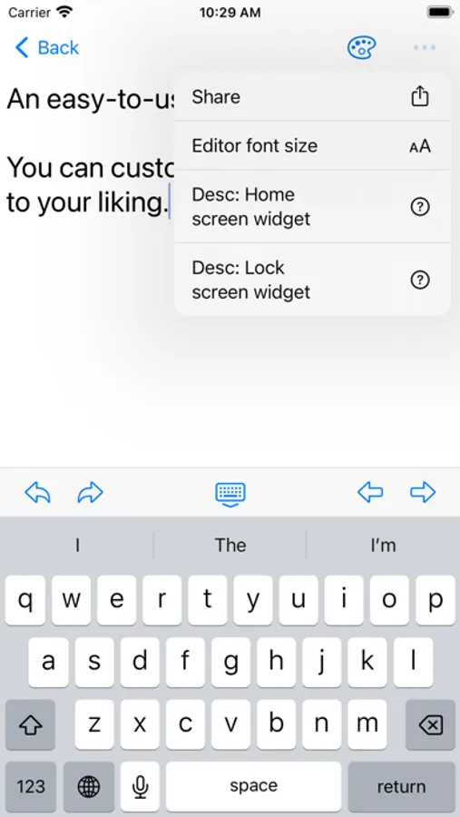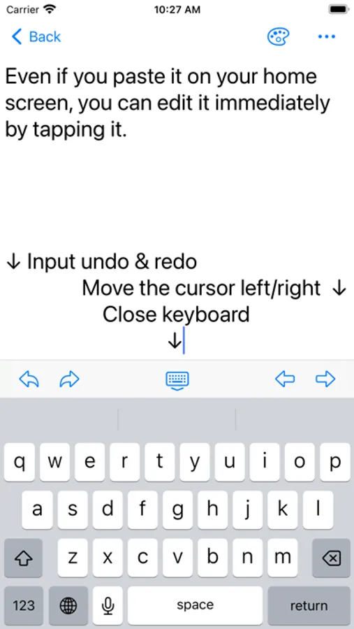 The in-app text editor has features for undo & redo and left/right movement of the cursor.