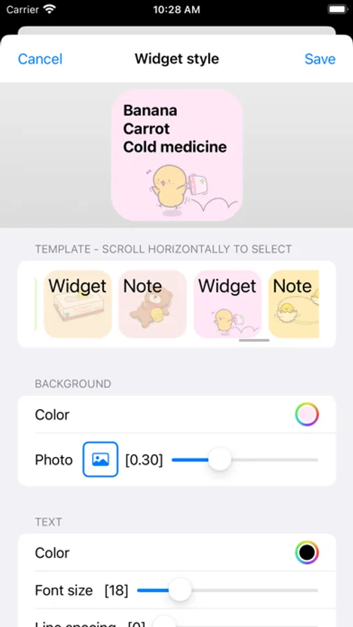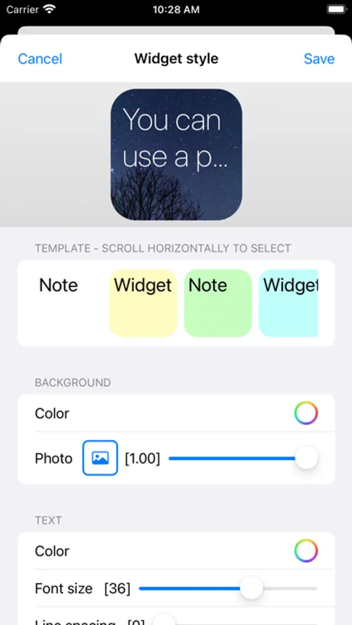 This app widget has a three-layered structure: background color, photo (transparency can be changed), and text, and you can change the appearance to your liking.