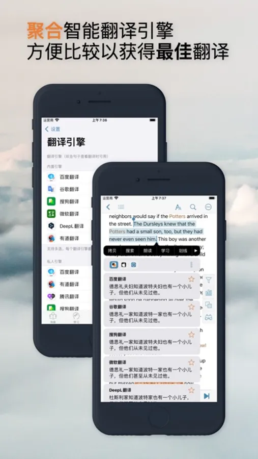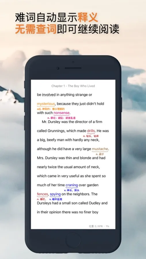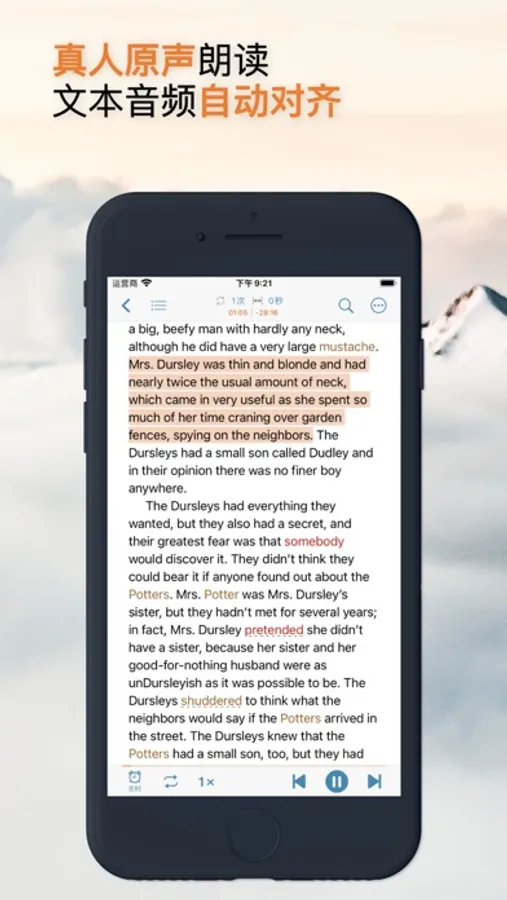 TYReader supports importing abridged books, pictures books, news and original books. Each book can contain an audio of a native English speaker reading the book. When playing the audio, the book will highlight the current sentence being read.