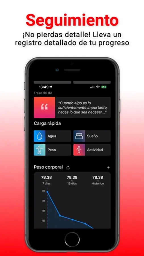 - Registro de peso y medidas corporales: Mantén un seguimiento de tu progreso registrando tu peso y medidas corporales regularmente. Nuestra app te permitirá visualizar gráficos y estadísticas para evaluar tu evolución.