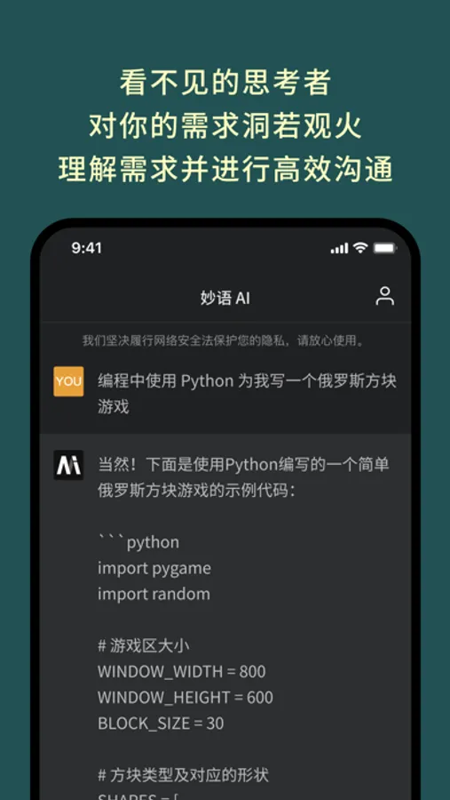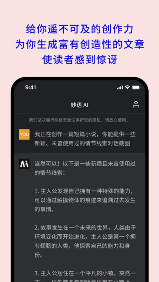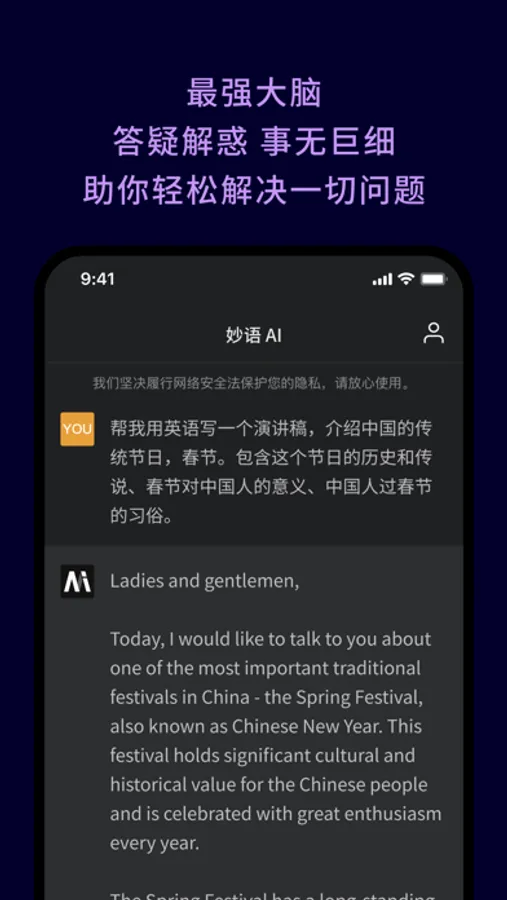 妙语 AI 是一款人工智能助手,它能超越你的想象界限,输入你的问题,它将给你超乎预期的答案。稳定、方便、快速的满足您在工作和生活中的各种需求,大投入的商业接口、专业线路、快如闪电的提供全方位的支持保证。同时我们基于网络安全法,严格保护您的隐私。