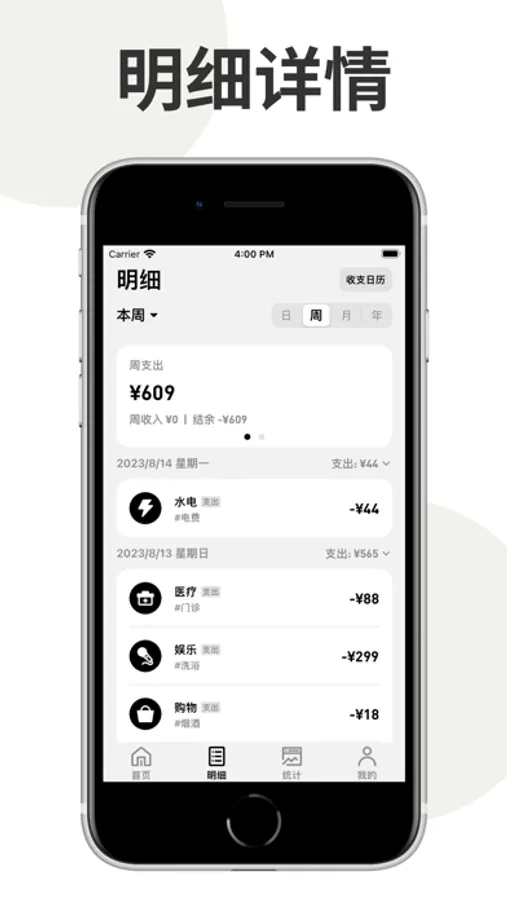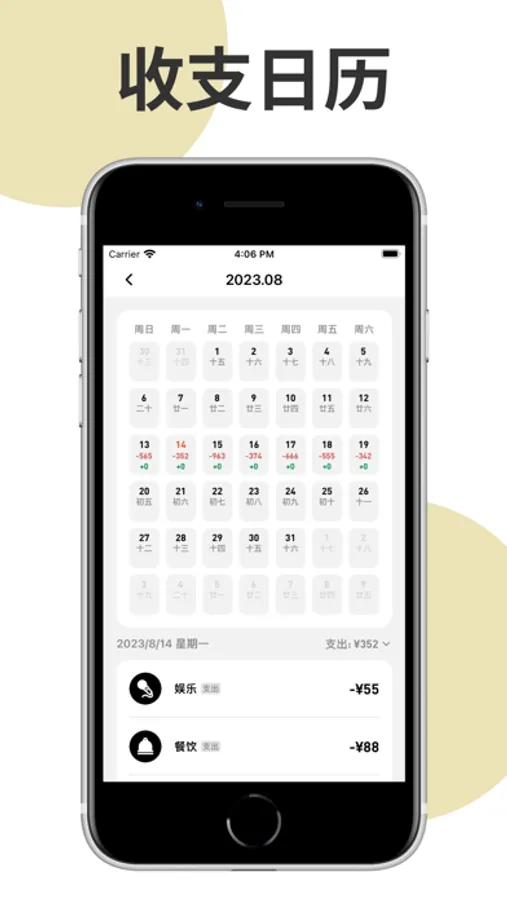 -- 记账日历:每日花费和支出均以日历的形式展现,一目了然。