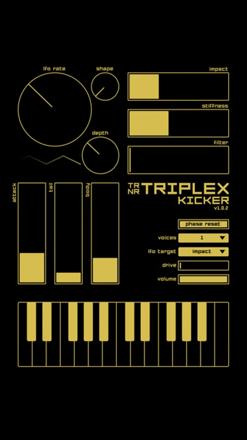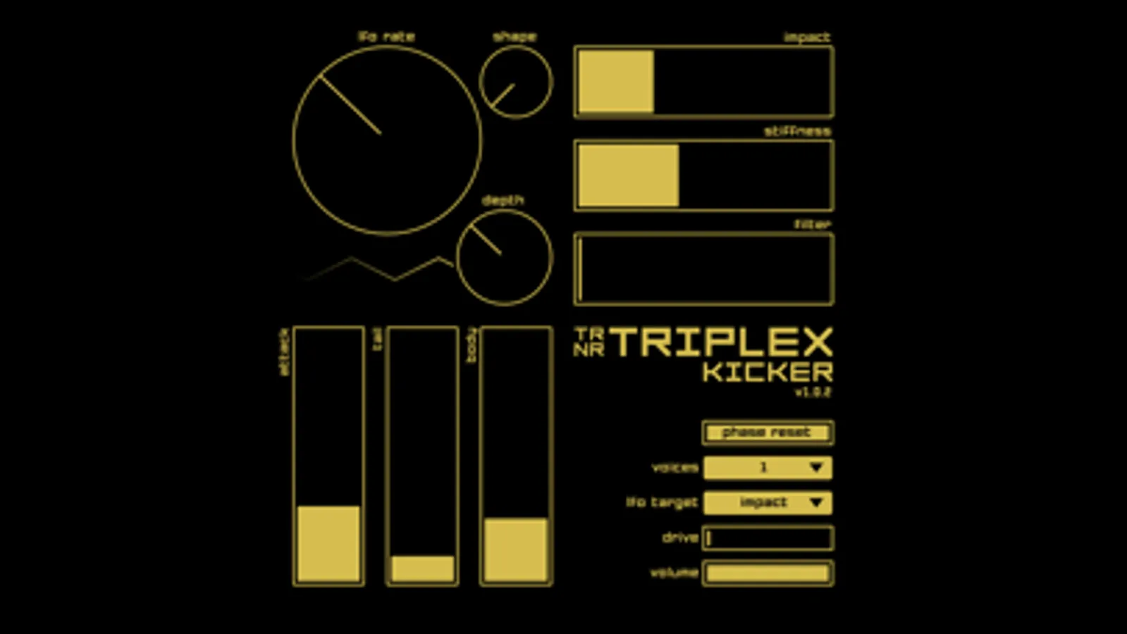 Triplex Kicker is a 3 operator FM synth specializing in kick and tom sounds. The sound can easily be manipulated with 6 simple controls and the unique integrated envelope generator shapes the sound in a way that makes it sound like a perfectly compressed kick. Use the filter to do DJ-style highpass filtering, the LFO for experimental shape-shifting tom sounds and top it all off with a dash of soft clipping with the drive control.