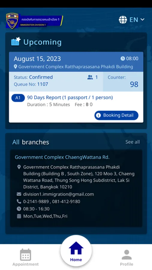 Online booking for Thailand Immigration Division 1 service. Realtime service booking ,manage your booked (reschedule, cancel). Send notify to remember you're booked.