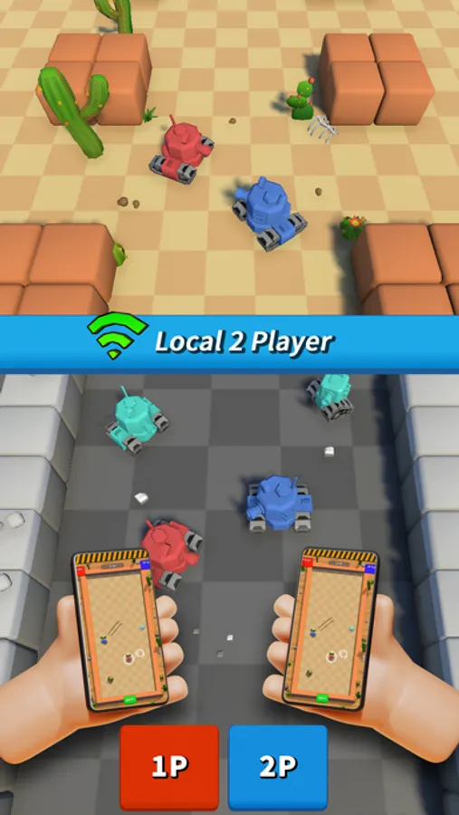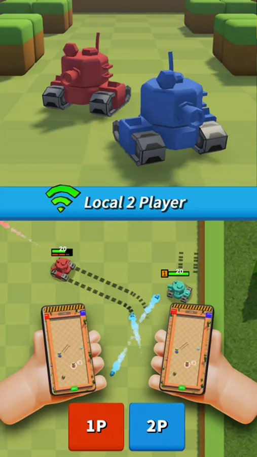 1P VS 2P mode: Shoot at each other, dodge bullets, without enemy tanks.