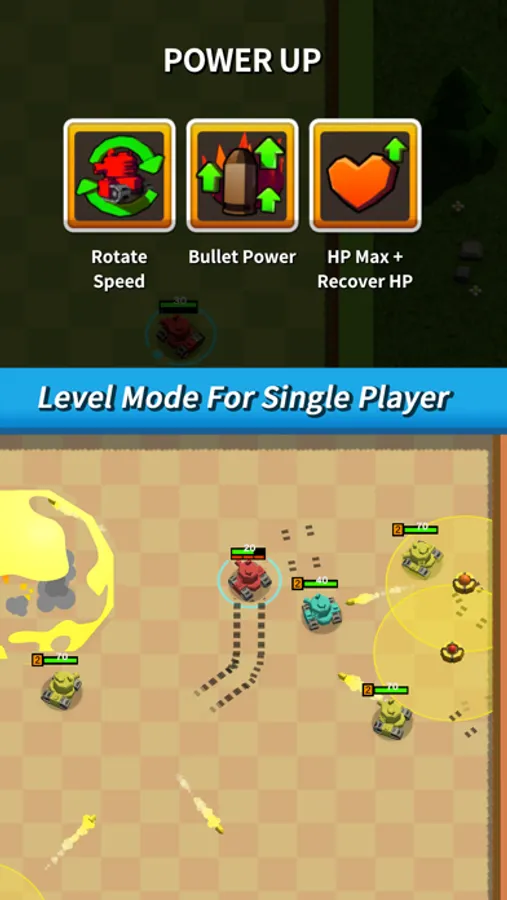 There are four types of tanks to choose, with differences in speed, HPMax, and bullet power etc.