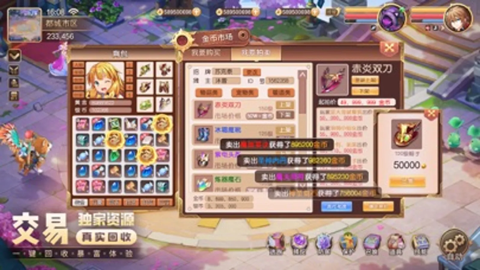 上架稀有道具、装备、技能书等到物品交易平台,与其他玩家自由买卖;用不到的道具,背包直接出售获得大量游戏币!