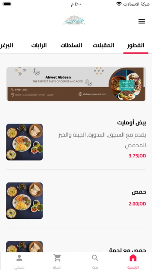 نقدم لكم اطباق الفطور والمقبلات والسلطات والمشروبات الباردة والساخنة وغيرها بأفضل الأسعار.