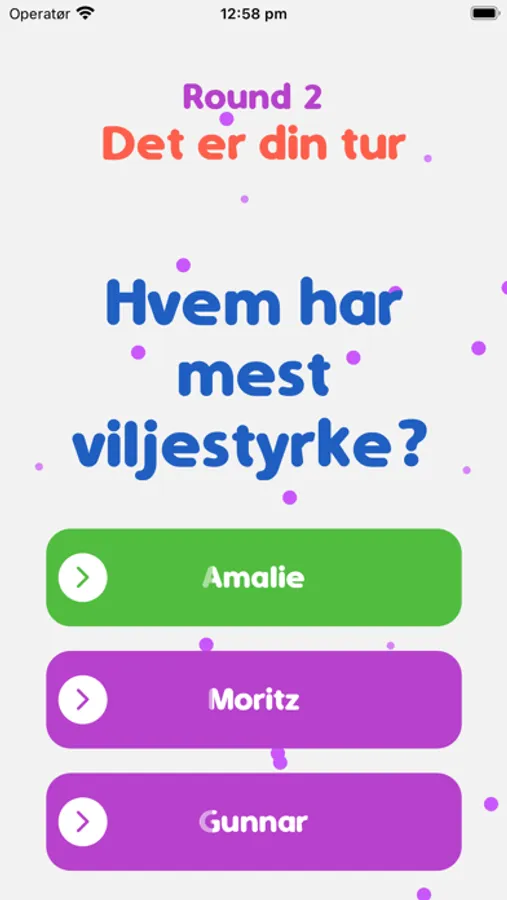 Fun game to play with your friends: Each round one player picks another player that fits best with the statement. The player picked gets to pick a new player for the next statement. Every fourth round everyone has a vote.