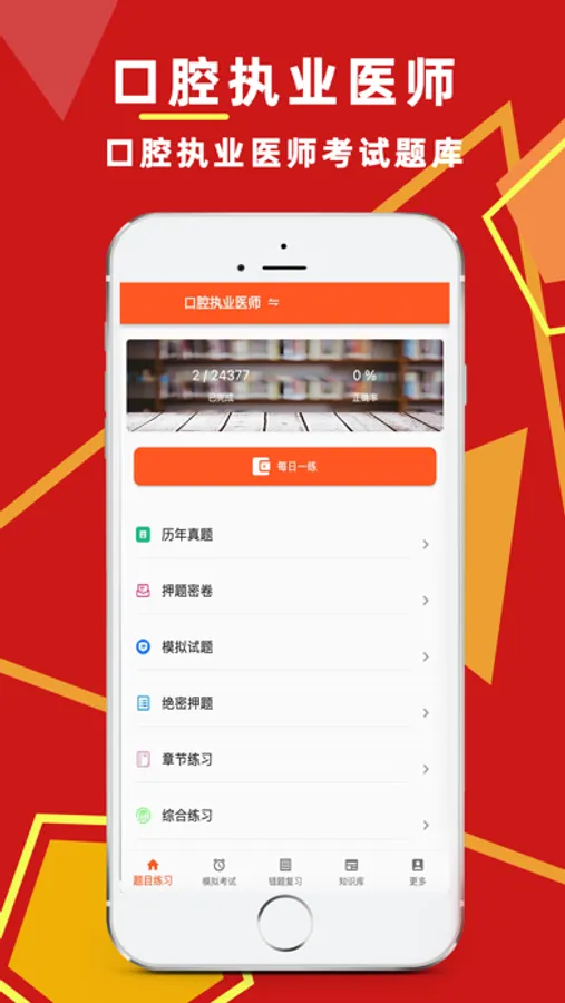 口腔执业医师2024考试题库包括:基础医学、医学人文、预防医学综合、临床医学、口腔临床医学等,题库随时随地更新,章节练习+智能组卷+历年真题+错题库助你考试通关必备。