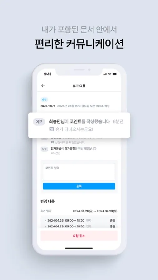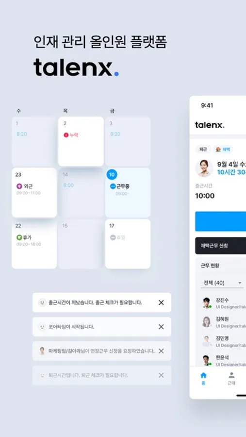 - 알림 : 근태/인사/신청서등의 알림을 수신하기 위해서 필요