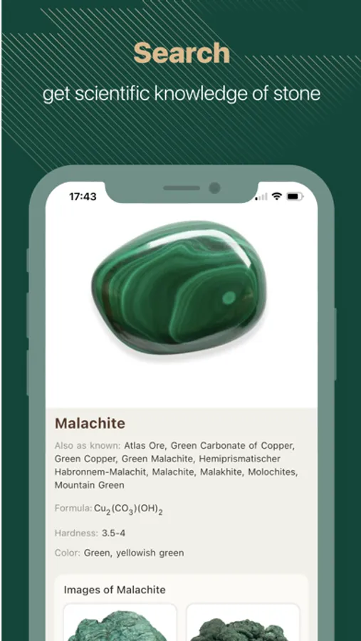 In each of the identification results, this Rock identifier app provides detailed stone/crystal information which includes: Name, Chemical Formula, Hardness, Colour Variations, and the main locations it can be found.