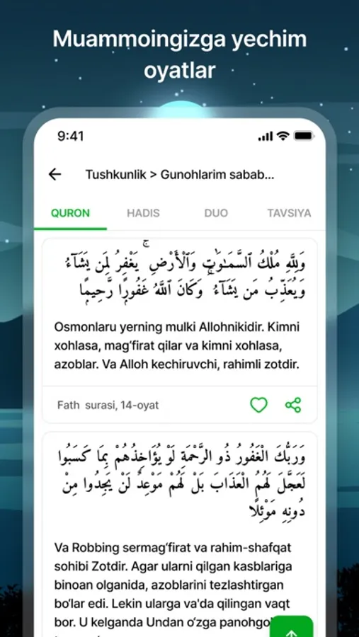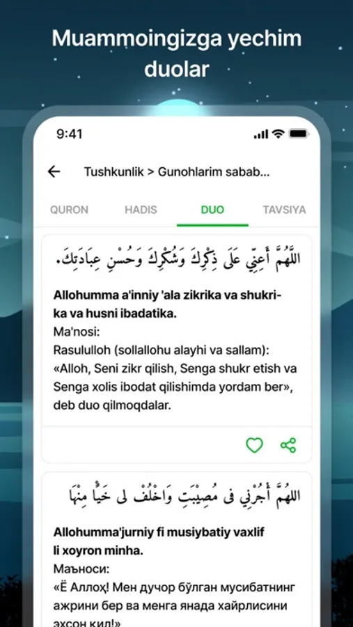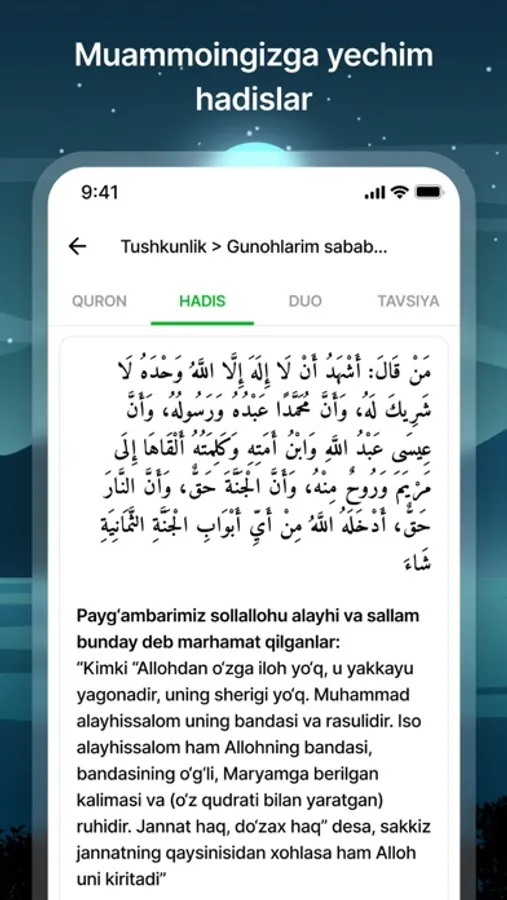 Saadah ruhiy salomatlik va farovonlikka erishish uchun islom tamoyillariga tayangan yechim taqdim qiladi. Kundalik muammolaringizga Qurondan oyat, Hadis, duo va ulamolarning tavsiyalari kabi yechimlarga ega bo’ling va ruhiy salomatlikka erishing.