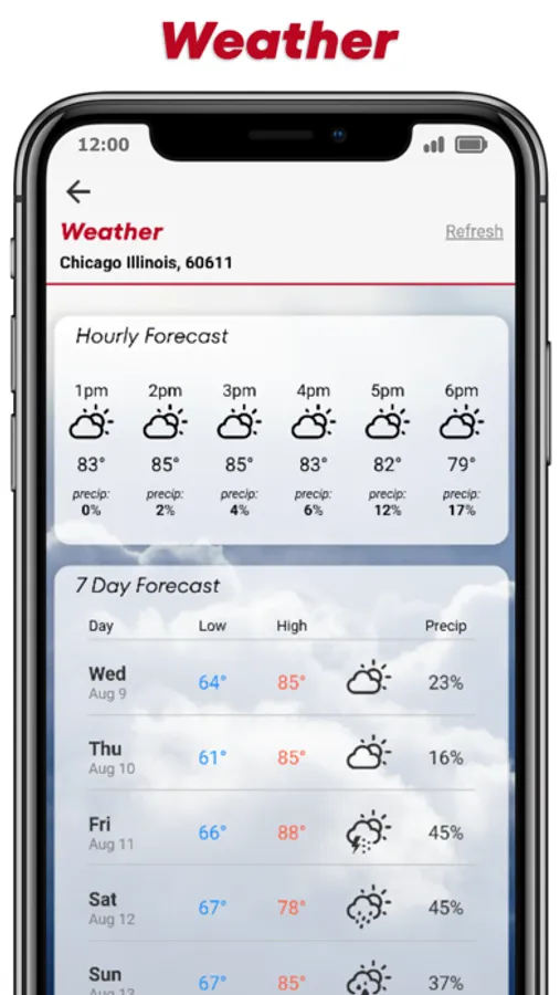 * Weather Updates --- Get current weather, 7 day forecast, and hourly forecast for your location.