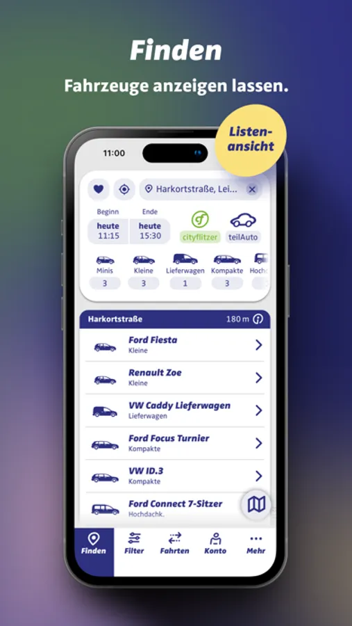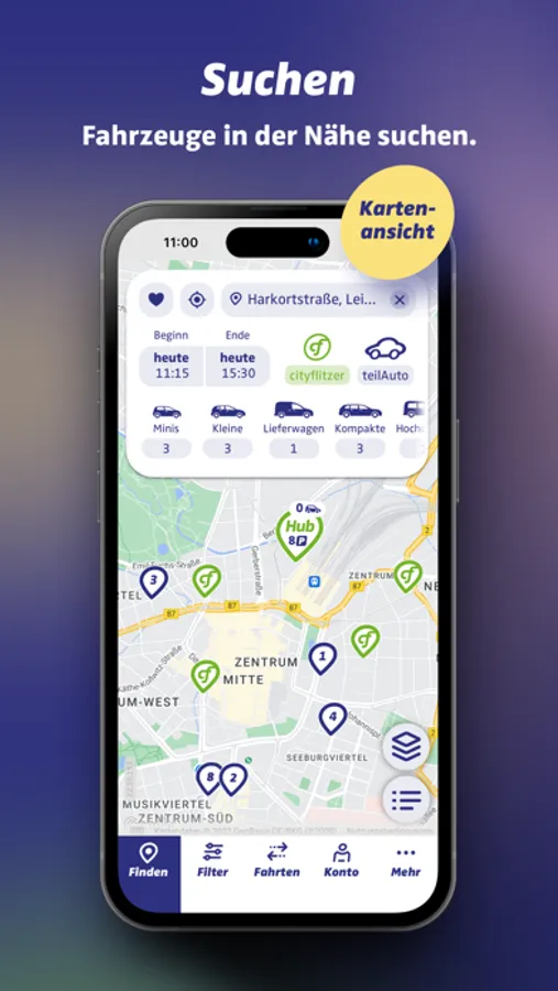 Autos finden Sie bequem und einfach per Standortsuche oder Adresseingabe. Wagen in Ihrer Nähe können Sie sich auf der Karte oder als Listenansicht anzeigen lassen.