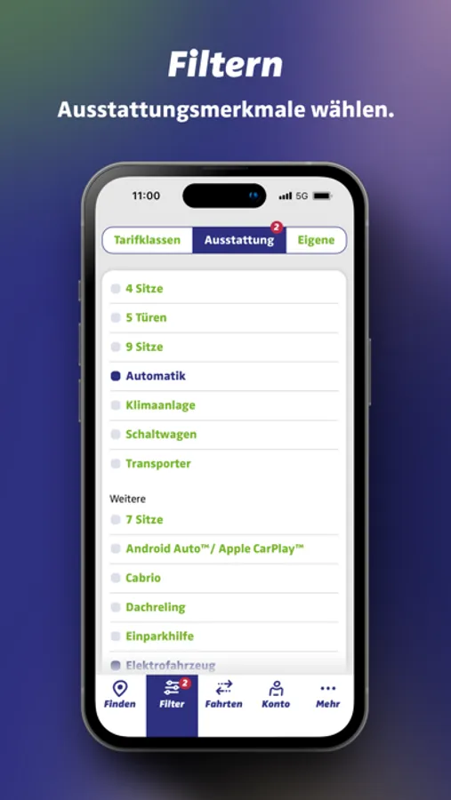 Sie suchen eine bestimmte Fahrzeugklasse, einen Wagen mit Automatik oder ein E-Auto? Über die Filter-Funktion präzisieren Sie Ihre Suche mit wenigen Klicks.