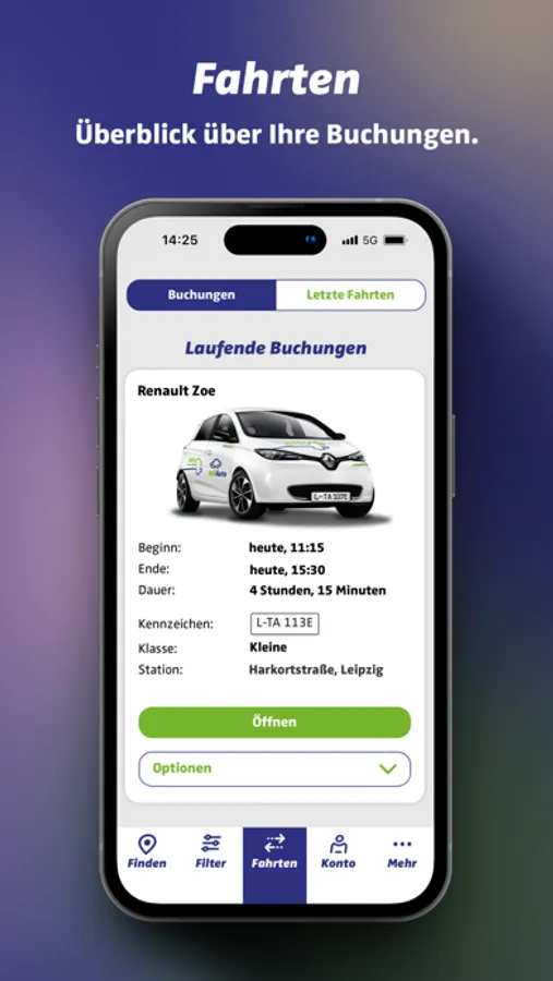 Die App listet laufende und zukünftigen Buchungen auf. Schnell und unkompliziert können Sie Infos zu Fahrzeug und Station abrufen, Buchungsdaten ändern oder Probleme melden. Außerdem gibt es eine Übersicht Ihrer vergangenen Fahrten und deren Kosten.