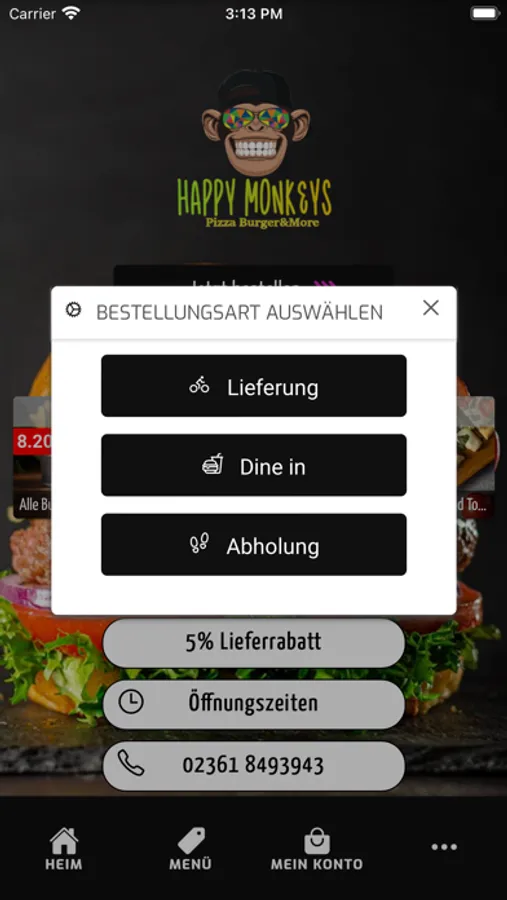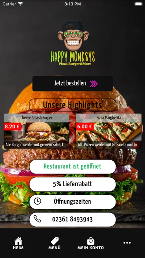 Herzlich Willkomen bei Happy Monkeys in Recklinghausen. Wir bedienen unsere Kunden mit Burger, Pizza, Nudelgerichte, Streetfood Speisen und machen das seit mehreren Jahren aus Leidenschaft. Wir freuen uns immer wieder neue Kunden unsere Herkunft näher zubringen und möchten ihnen die Möglichkeit geben, ihre Bestellung unkompliziert und total einfach abzugeben. Aus diesem Grund, möchte wir ihnen unsere neue App und unseren Online Shop vorstellen, mit dem Sie problemlos über Paypal, Bar und Kreditkarte zahlen können.