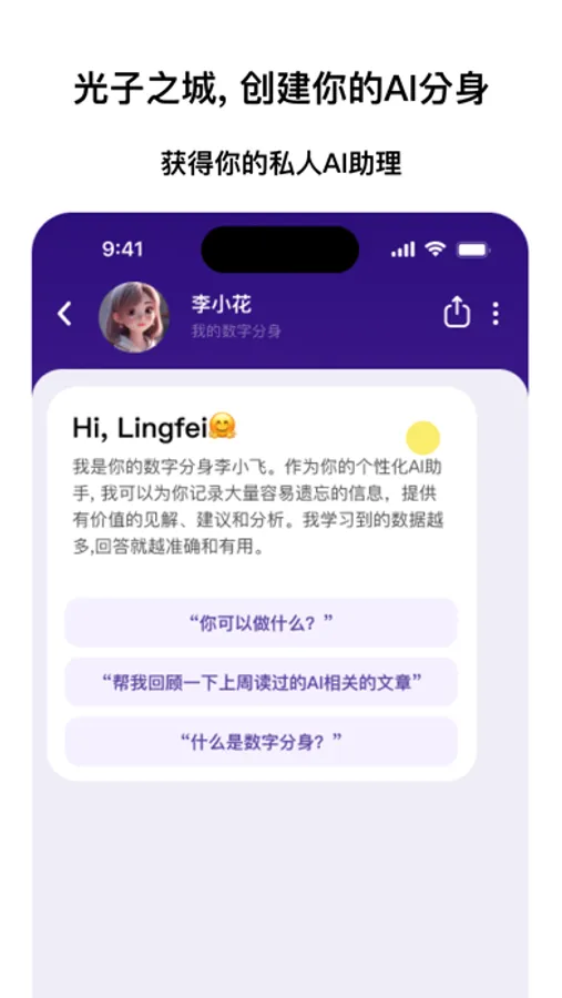 聊天互动——畅所欲言,倾诉心声 光子之城为您提供智能聊天功能,您可以与AI伙伴畅所欲言,无拘无束地倾诉心声。无论是寻求安慰、分享快乐,还是需要专业建议,您的AI伙伴将始终陪伴在您身边,倾听和回应您的需求。