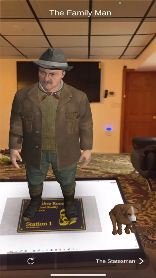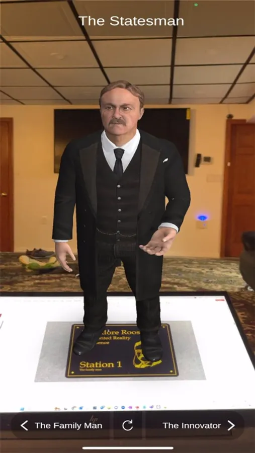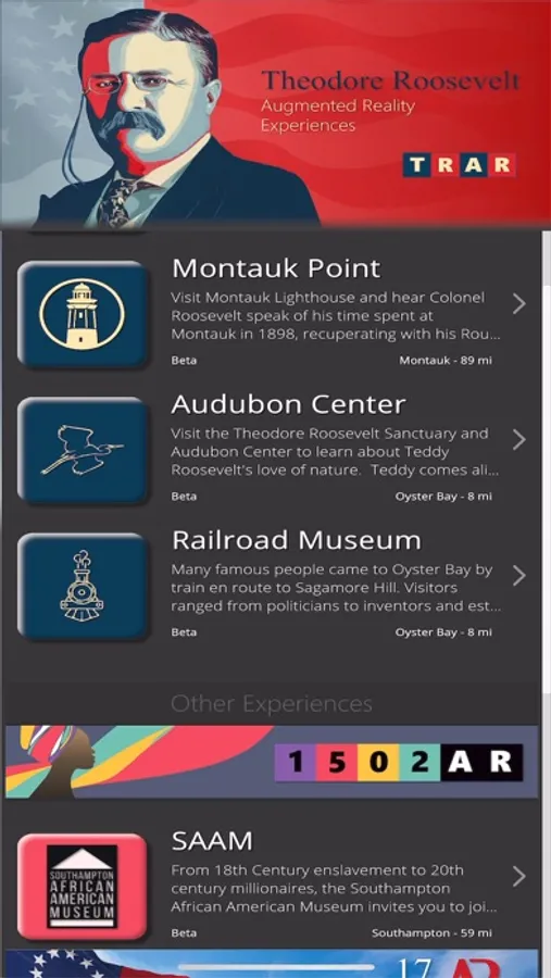 TRAR is an Augmented Reality App that provides engaging experiences interacting with Theodore Roosevelt and his family. The experiences are available at various Long Island locations relevant to Roosevelt's history. The app is both entertaining and educational.
