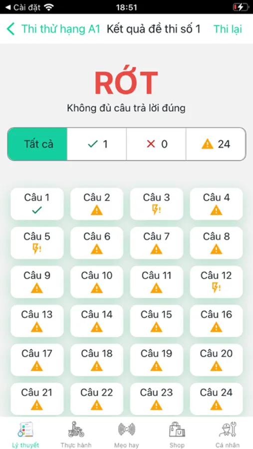 • Danh sách các câu hỏi đã làm sai giúp nhanh chóng ôn lại phần lý thuyết.