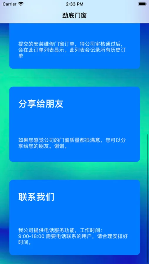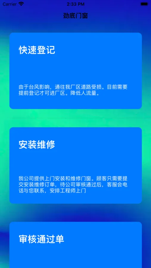 我公司提供上门安装和维修门窗。顾客只需要提交安装维修订单,待公司审核通过后,客服会电话与您联系,安排工程师上门