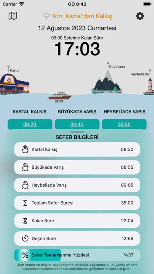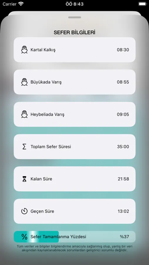 • Mevcut seferin bitmesine kalan süreyi, geçen süreyi, sefer tamamlanma yüzdesini, toplam sefer süresini görebilme.