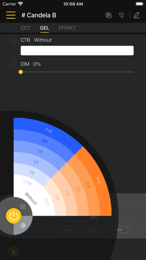 GEL-Modus: Der GEL-Modus dient der Anpassung der Kälte bzw. Wärme des Lichts über verschiedene Blautöne oder Orange-Abstufungen.