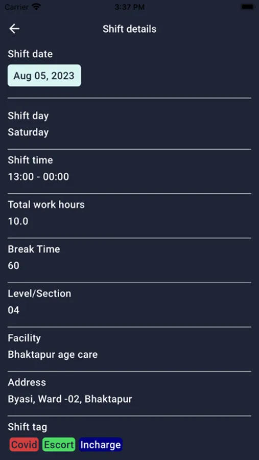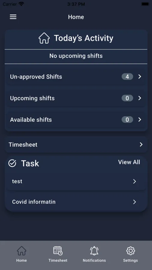 Home page: You will be able to monitor all your upcoming shifts, View shift details and important shift notes, accept new available shifts and view and complete tasks given to you all from your home page.