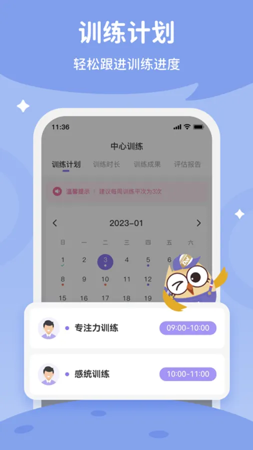 为多特儿童专注力会员展示训练计划信息,提供调训请假功能,同时通过训练数据统计模块(训练时长、参训率图表、打卡频率图表)和训练成果模块(评估报告、能力趋势图、训练反馈报告)直观地展示训练情况。此外,为会员提供育儿宝典、每日成长、智慧家长学堂、情商培养、习惯养成工具、手指操指导、优质书籍推荐等高质量板块,从而培养儿童认知能力,提升儿童社会适应能力。