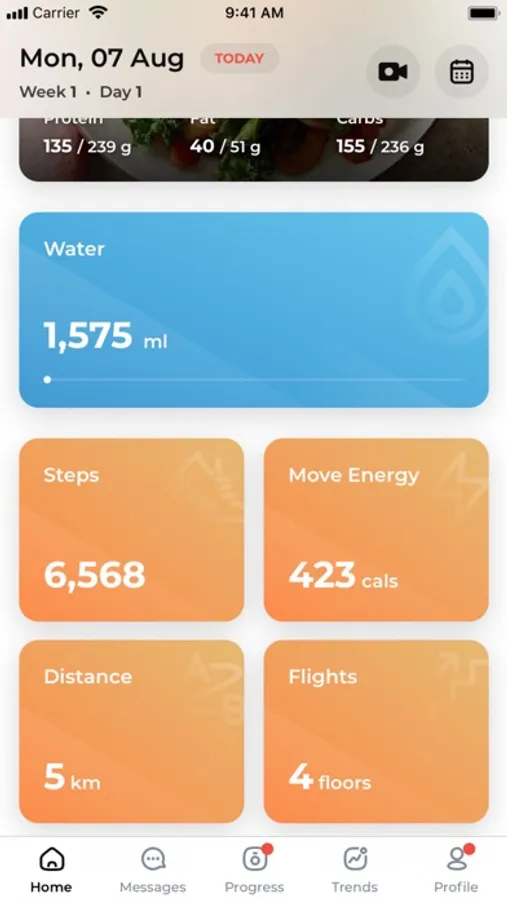 The app integrates with Apple Health to show your daily activity - distance, steps, active energy, and flights to help you better achieve your goals.