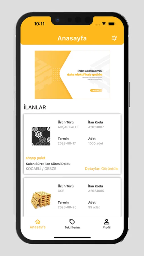 Artık, bu benzersiz platformun mobil uygulamasıyla, "PaletMerkezi.com" deneyimini cebinize taşıyoruz. Bu uygulama, kullanıcıların her yerden ve her zaman palet ilanlarına erişmelerini, teklif vermelerini ve ilanlarını yönetmelerini sağlamaktadır. Basit ve kullanıcı dostu arayüzü sayesinde, palet ihtiyaçlarınızı ve tekliflerinizi birkaç tıklama ile kolayca yönetebilirsiniz.