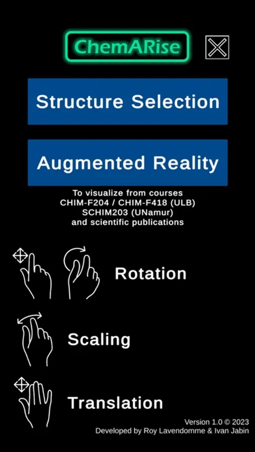 ChemARise contains a library of chemical structures that can be visualized in 3D and interacted with to apply rotation, translation and scaling.