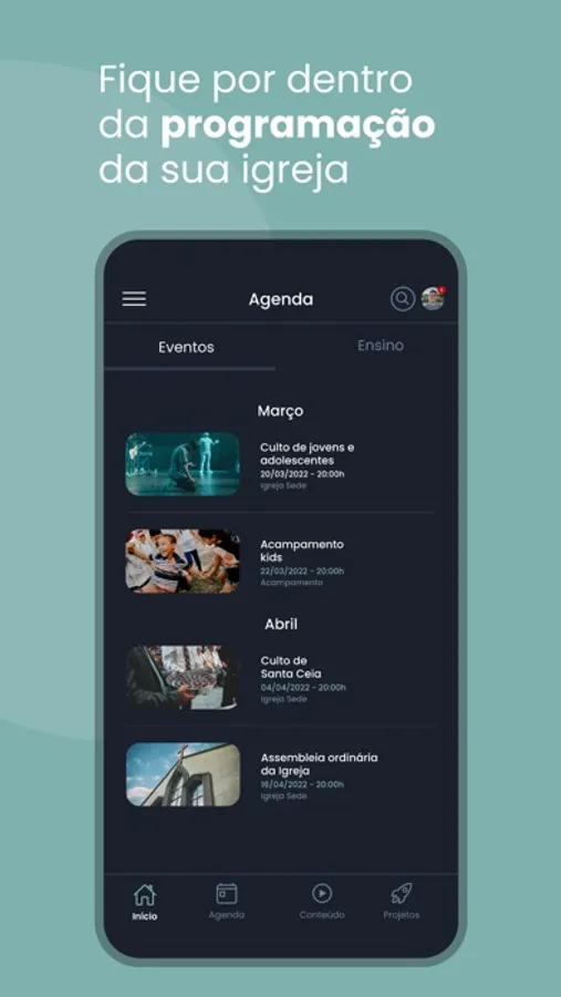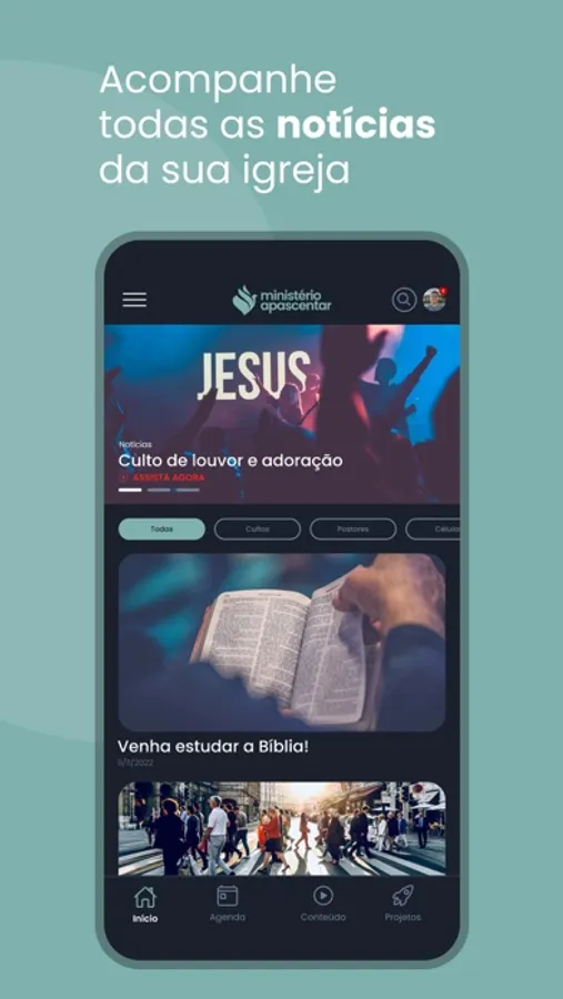 Recursos disponíveis no Aplicativo: Notícias, Agenda da igreja, Eventos, Conteúdos, Projetos, Transmissão ao Vivo e Módulo Ensino.