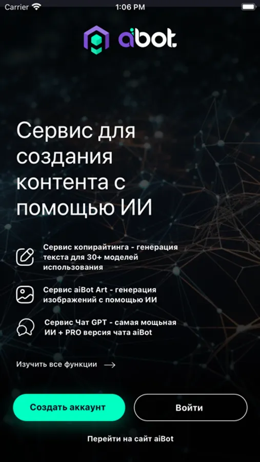 Все эти и многие другие функции уже доступны в web версии aiBot и мы планомерно добавляем их в приложение. Каждое обновление будет расширять функционал приложения. Вы можете использовать единый аккаунт для веб версии и приложений. Если Вы уже зарегистрированы в веб версии просто введите Ваши данные для в хода в приложение.