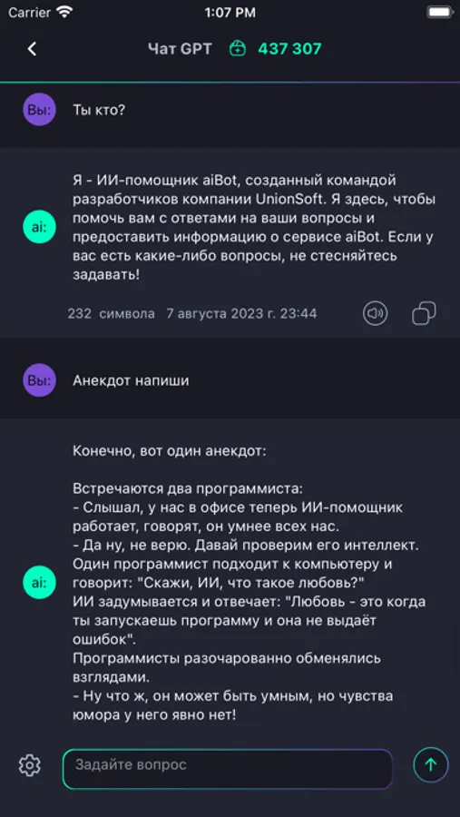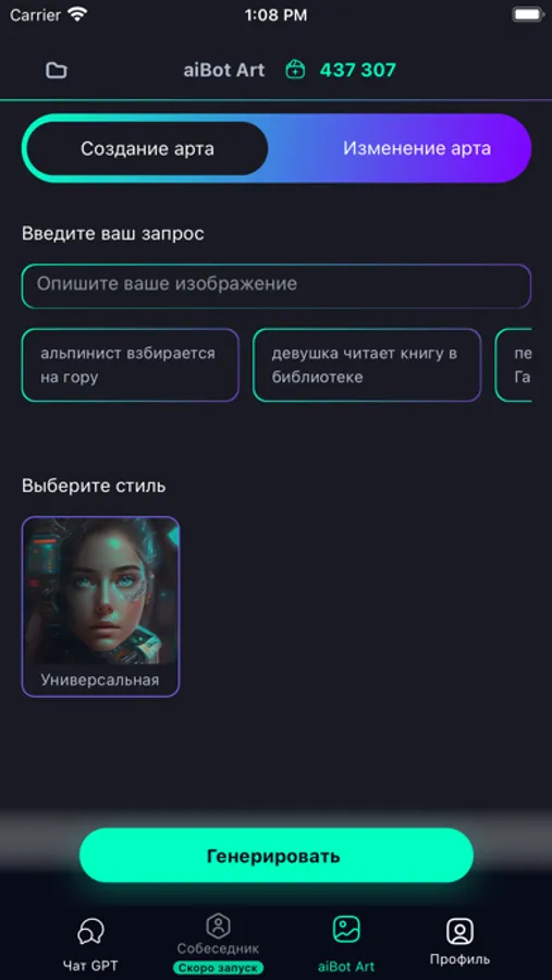 Добро пожаловать в мир ИИ. ai Bot - сервис для генерации текста и изображений с помощью нейронных сетей. Айбот использует собственные модели и ChatGPT & GPT-3,5 & GPT-4. Создавайте уникальные изображения с помощь нейронной сети aiBot Art основанной на технологии stable diffusion. ai Bot Chat - это улучшенная версия популярного сервиса ChatGPT, с функцией собеседника, дополнительно обученная на большом количестве данных.