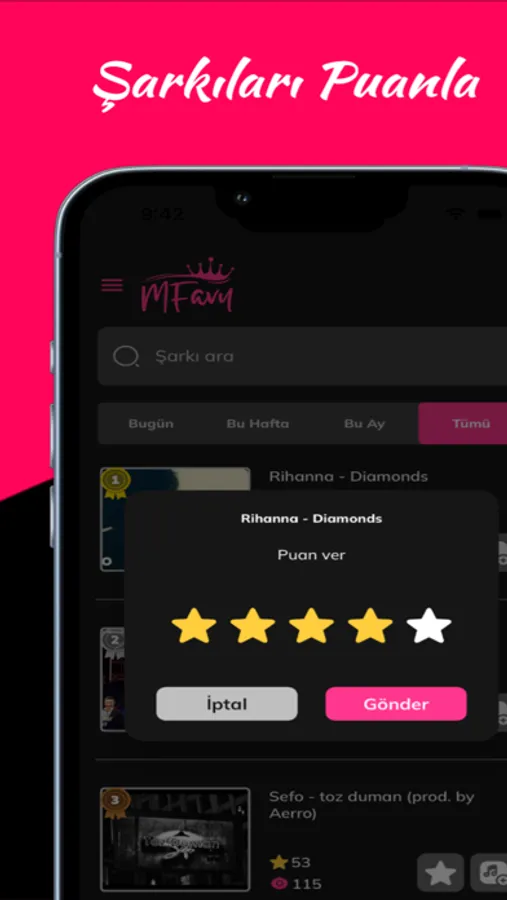 Kendi Müzik Zevkini Yansıt: MFavy'de dinlediğin şarkılara anında puan verebilir ve müzik zevkini yansıtabilirsin. Senin puanların, senin ritmin!