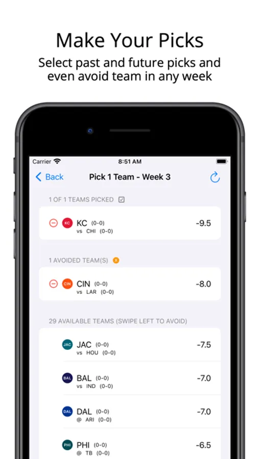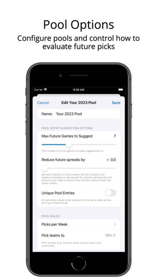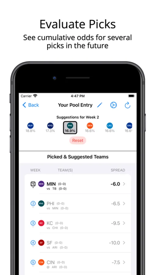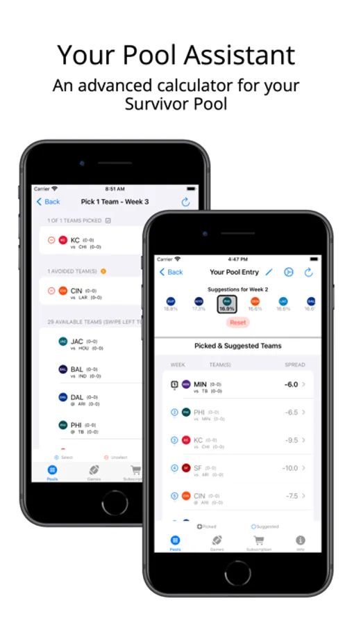 Make the best picks in your Survivor Pool or Elimination Pool to increase your chances of winning. Use the power of your device and up-to-date spreads to help suggest and review picks for several weeks into the future. Based on the game spreads, advanced algorithms calculate the optimal choices for multiple upcoming games.